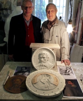 Dr. Andreas Thielemann mit dem Künstler Giovanni Gianese, Ersteller des Adam-Elsheimer-Epitaphs, in seiner Werkstatt