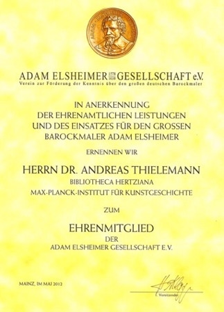 Die Adam Elsheimer-Gesellschaft e.V. trauert um ihr Ehrenmitglied Herrn Dr. Andreas Thielemann, Leiter der Bibliotheca Hertziana, Max-Planck-Institut für Kunstgeschichte in Rom, der am 17.02.2015 mit nur 59 Jahren verstarb. Mit ihm ist ein wirklicher Freund, Ratgeber und Förderer der Adam Elsheimer-Gesellschaft in eine andere Welt gegangen. Er war mehr als nur angetan von unseren Ideen und Aktivitäten, besonders auch von unserer Forschung um die Herkunft des Malers und unseren Veröffentlichungen. Unsere Absicht ein Straßenmuseum für den Maler Elsheimer zu bauen faszinierte ihn sehr und er gab immer wieder den Rat nicht aufzugeben, das Unmögliche doch noch zu schaffen, um dem Maler über den Museumsbereich hinaus einen größeren Bekanntheitsgrad zu verschaffen.
