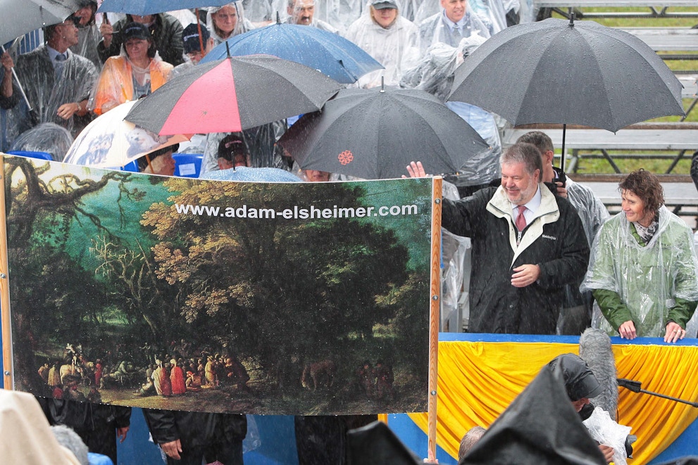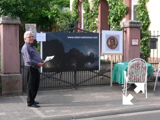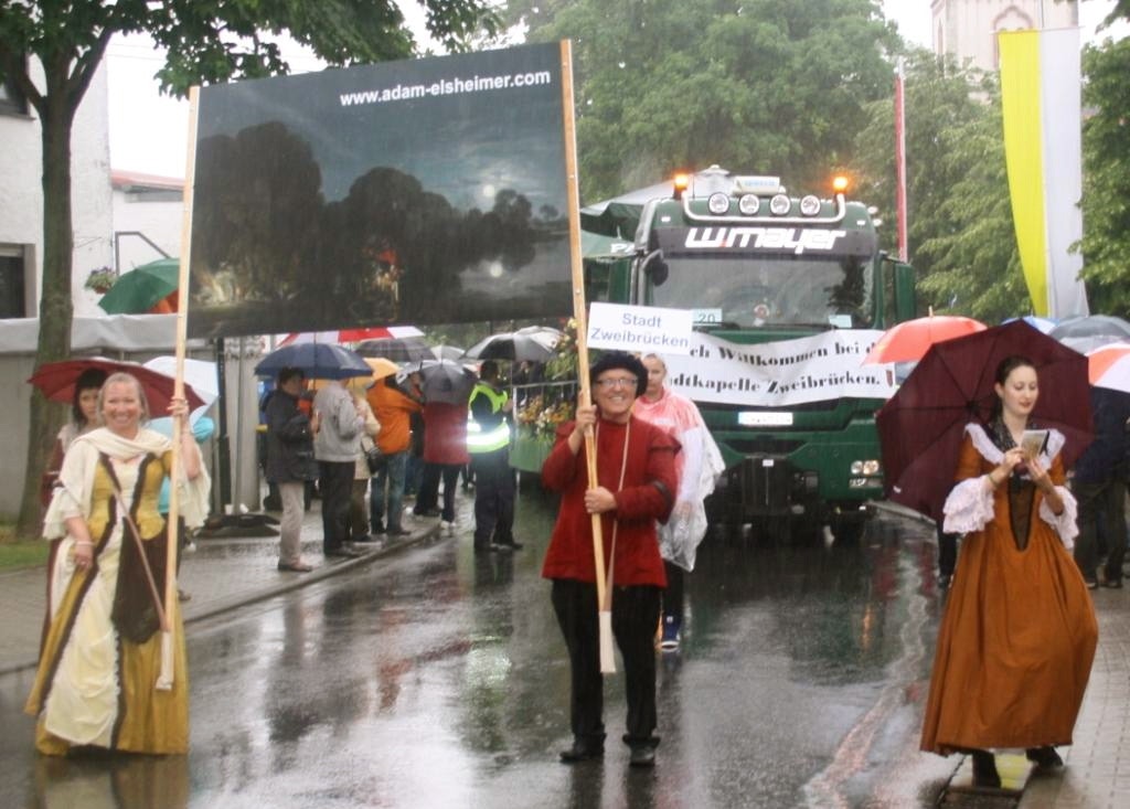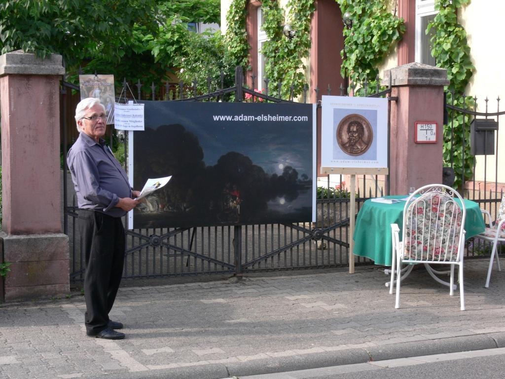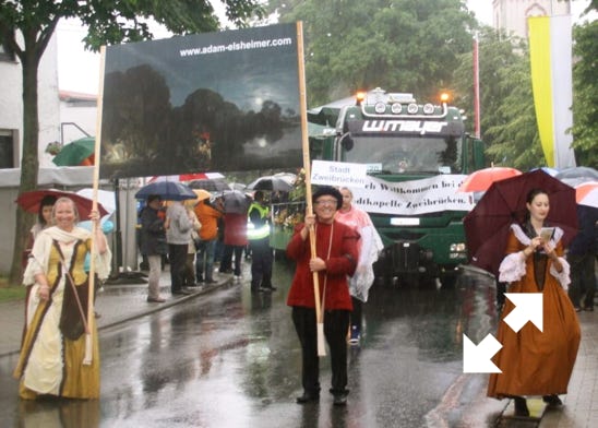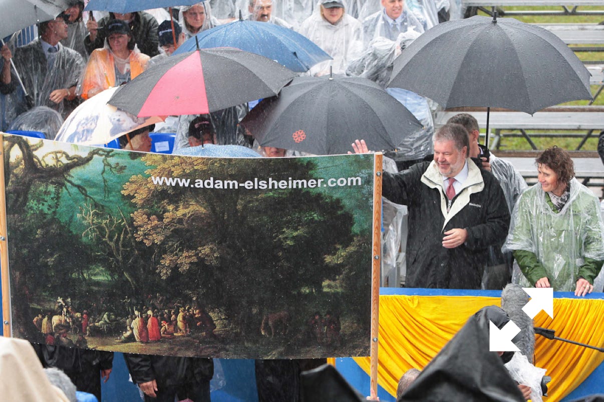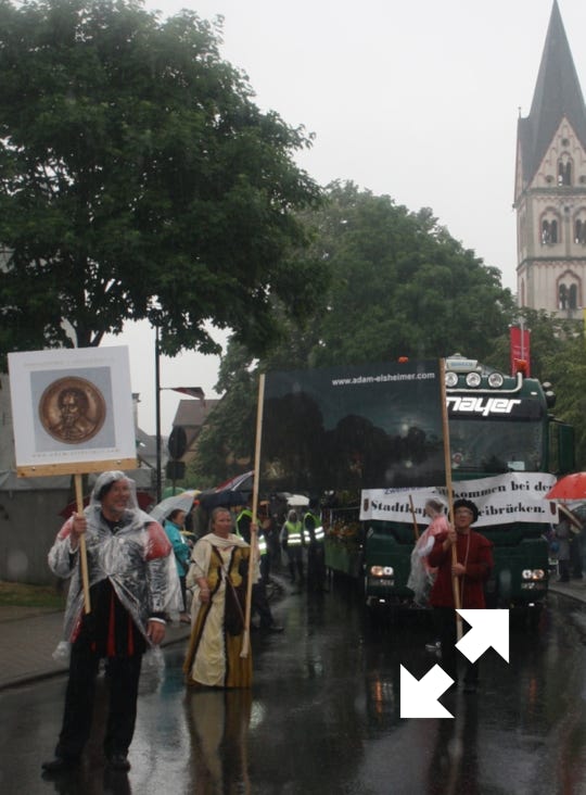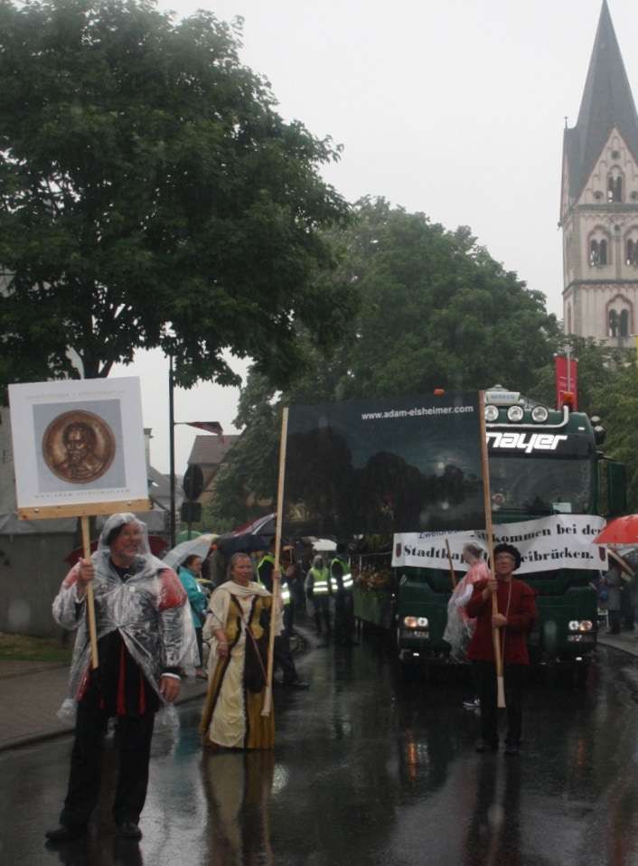 Um Adam Elsheimer und seine Kunst in der Bevölkerung bekannt zu machen, zeigten wir in der Straßenausstellung und im Festzug in Barockkleidern Vergrößerungen seiner Werke. Strömender Regen konnte uns dabei nicht abhalten. Szenen im Mainzer Schloss halten die Erinnerung an die damalige Zeit und an unsere Aktion wach.