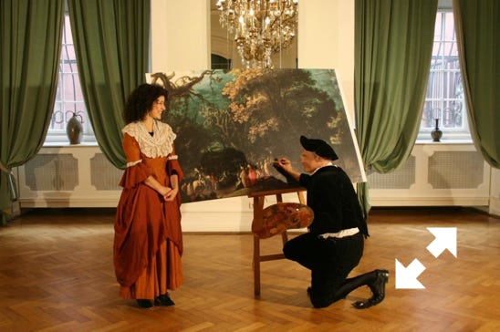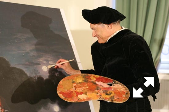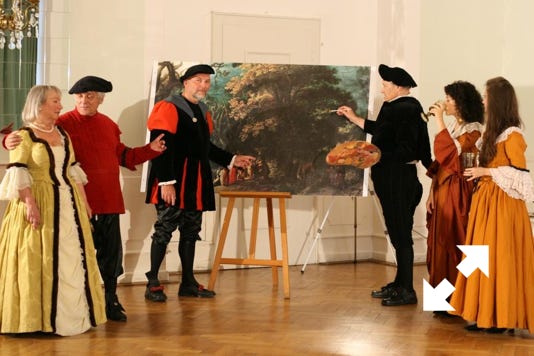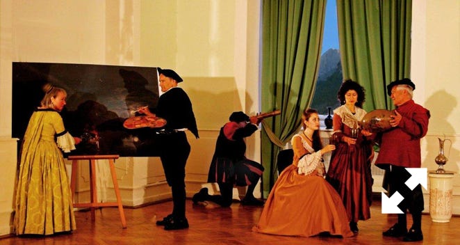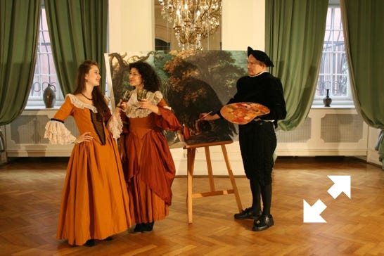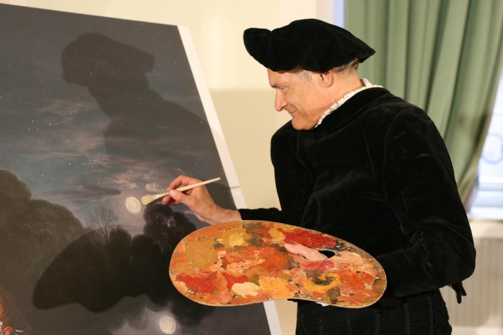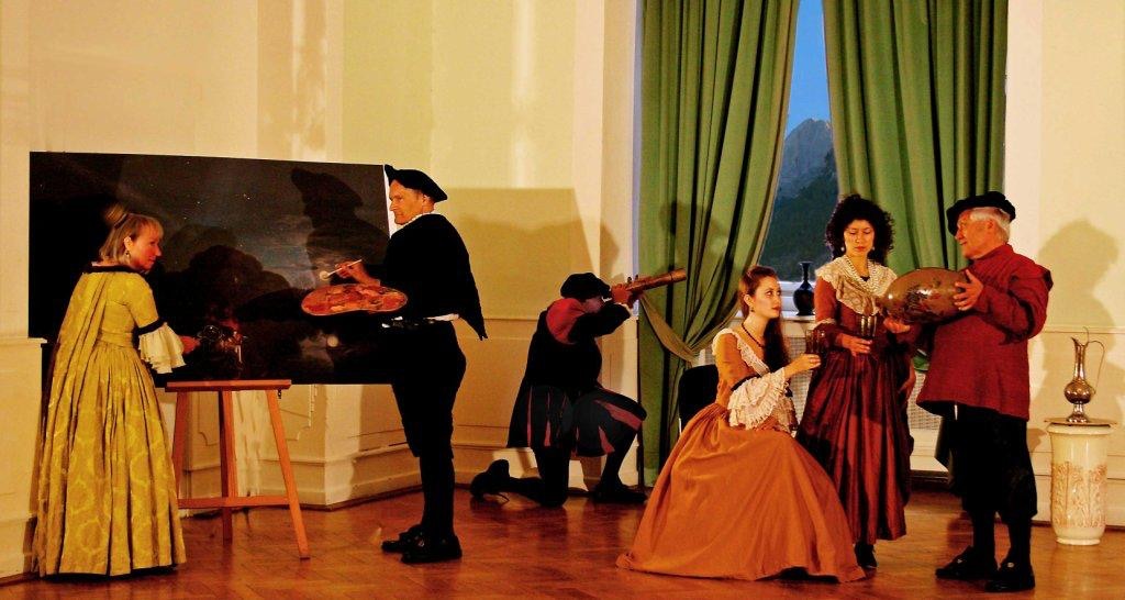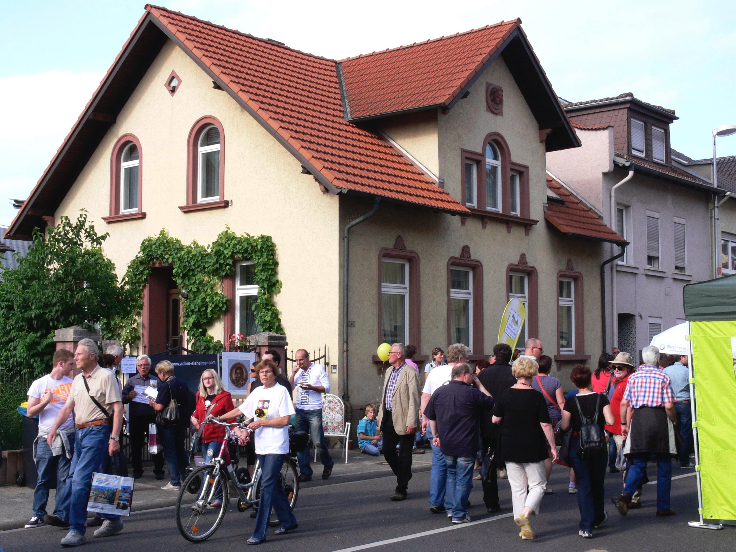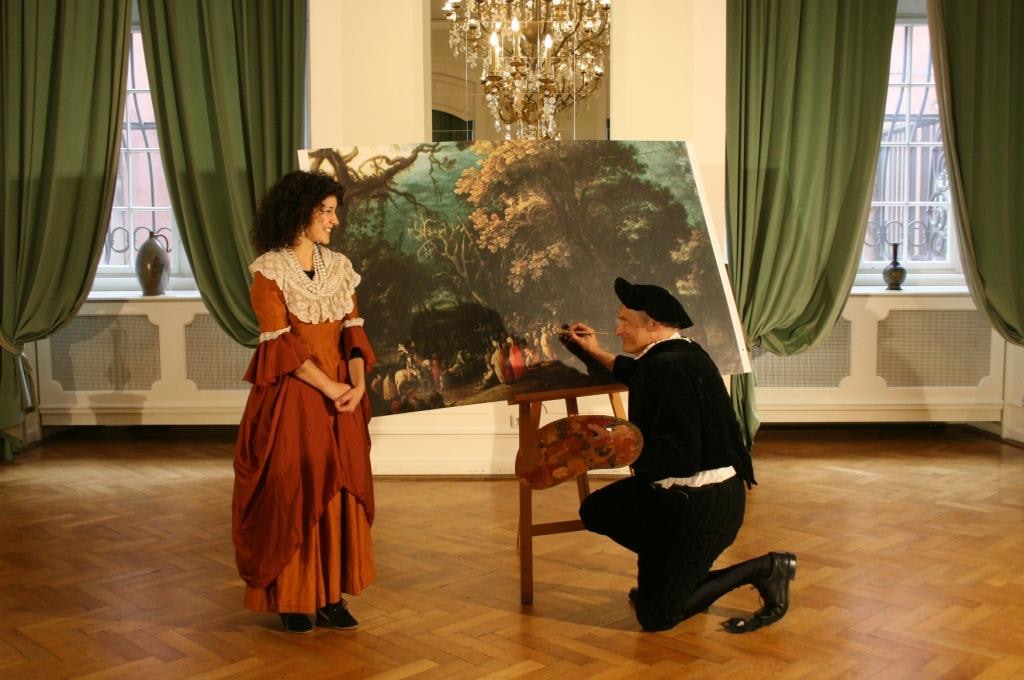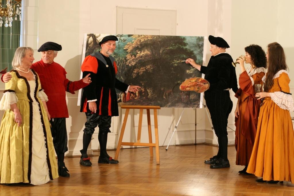 Um Adam Elsheimer und seine Kunst in der Bevölkerung bekannt zu machen, zeigten wir in der Straßenausstellung und im Festzug in Barockkleidern Vergrößerungen seiner Werke. Strömender Regen konnte uns dabei nicht abhalten. Szenen im Mainzer Schloss halten die Erinnerung an die damalige Zeit und an unsere Aktion wach.