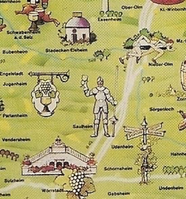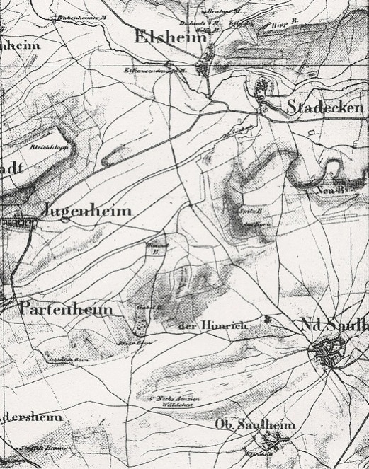 Der Jahrhunderte alte „Saulheimer Pfad“, durch Flurbereinigungen nicht mehr vorhanden, ist recht deutlich auf der alten Landkarte von 1823-1850 des Großherzogtums Hessen zu erkennen. Es ist die direkte und logische Wegstrecke, die die Vorfahren Adam Elsheimers bei ihrer Wanderung von Elsheim über Saulheim nach Wörrstadt (nur 3 km weiter) wahrscheinlich genommen haben. Dort wurden sie Elsheimer genannt.