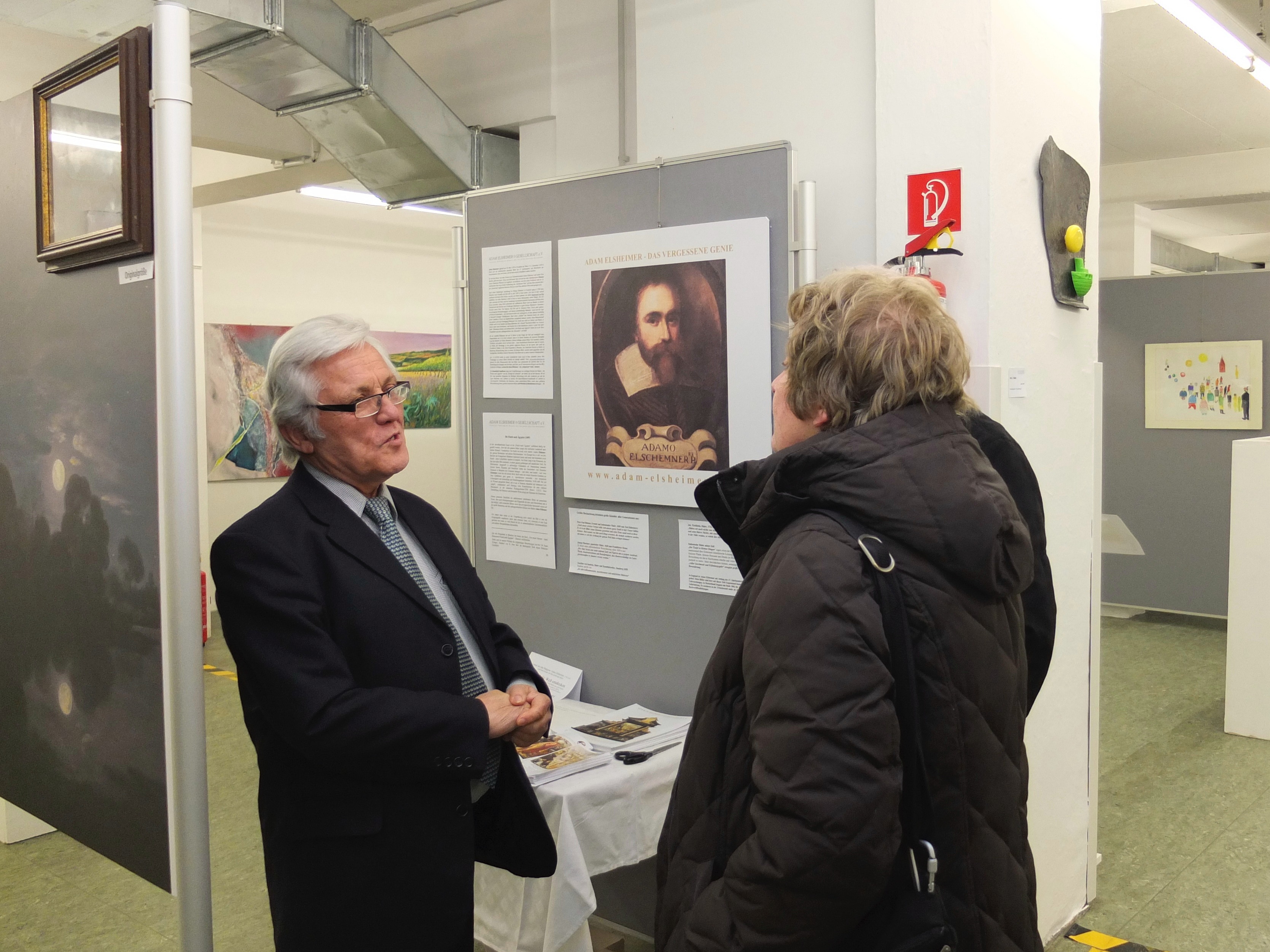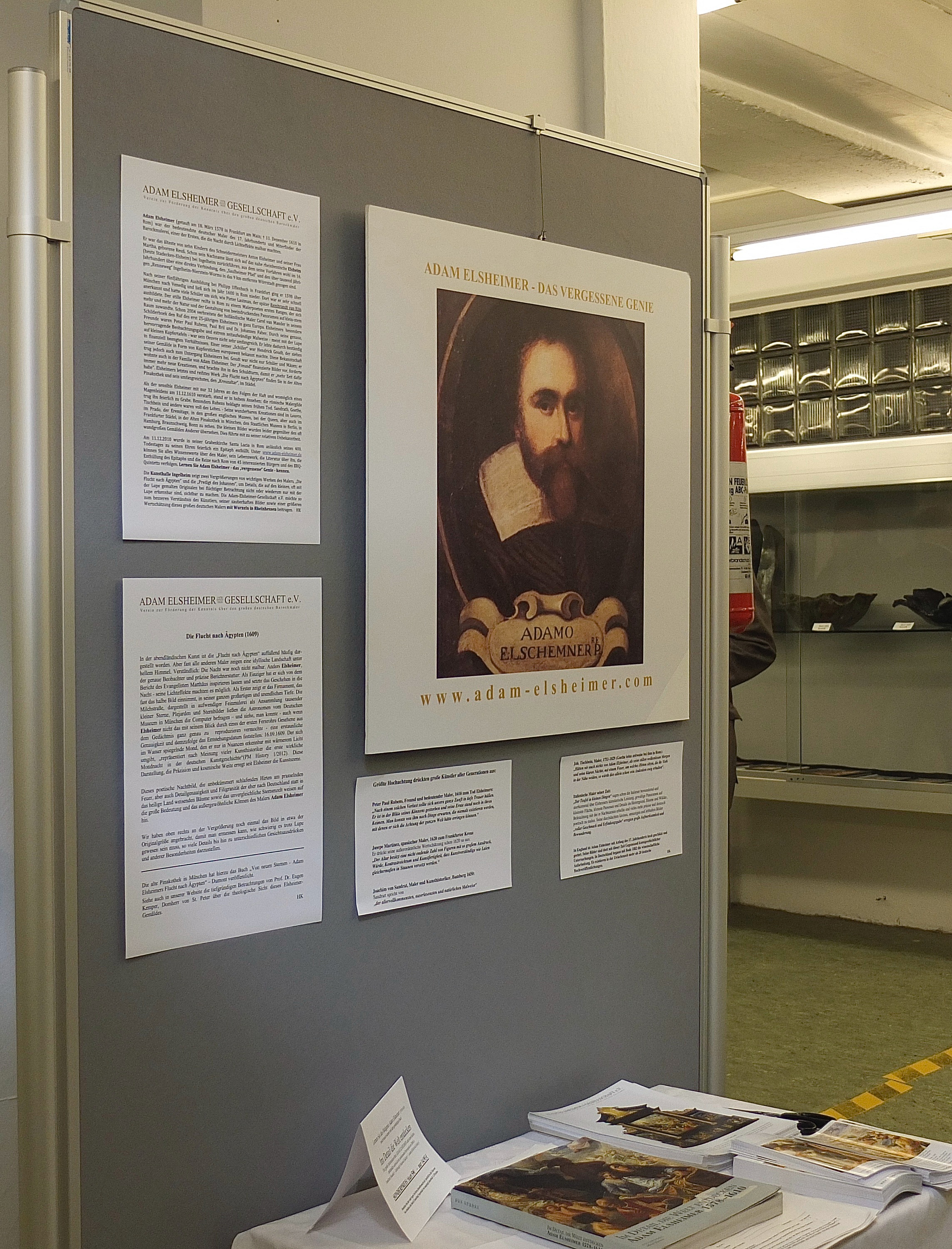 15 Ingelheimer Künstler stellen sehr ansprechende Werke aus und zeigen eine überraschende Breite des Ingelheimer Künstlerlebens. Die Adam-Elsheimer-Gesellschaft zeigt die Vergrößerungen der beiden Motive „Flucht nach Ägypten“ und „Die Predigt des Johannes des Täufers“ und geht unter anderem speziell darauf ein, dass wegen der geringen Größe der Originale die Elsheimer-Werke gegenüber den großflächigen Gemälden anderer berühmter Maler oft übersehen wurden und so der Bekanntheitsgrad des Künstlers in der Öffentlichkeit behindert wurde. Das zu ändern sei das erklärte Ziel der Ausstellung. Außerdem könne man anhand der Vergrößerungen auf viele Details aufmerksam machen, die man auf den Originalen nur mit der Lupe richtig beurteilen kann.